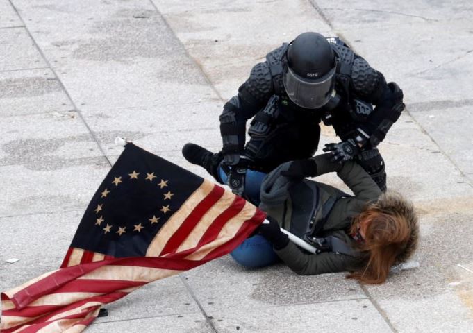 Полицајац хапси демонстранткињу током протеста испред Конгреса САД, Башингтон 06.01.2021 – Фото: Ројтерс