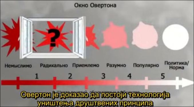 Јер, ако некоме то буде у интересу, провући ће и Вас и друштво коме припадате кроз процедуру звану прозор овертона, па ћете расправљати, потпуно убеђени да то није ништа страшно, кроз десетак година, да ли је боља шницла или крменадла од човека? А ако, тада, када то буде општеприхваћено, будете неки „чудак“ који се канибализму јавно супроставља, врло је вероватно да ћете „заглавити“ у затвору! Ми смо већ изложени процедурама промене свести које нам, од, у почетку потпуно неприхватљивих појава, стварају атмосферу да оне постају, не само природне, већ и законом заштићене.