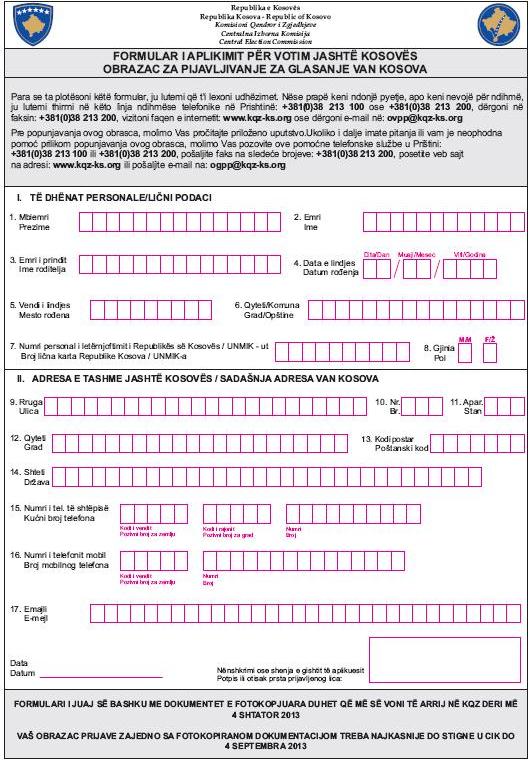 poziv-za-izbore-atifete-jahjaga-2Очигледно је да се не ради о бирачким списковима Републике Србије. Како је очигледно? Па тако што су људи који су добили позив за уписивање јасно видели да је на тим обрасцима за пријављивање „грб Републике Косова“ и натпис „Република Косово“ (на албанском, енглеском и нечему што би требало да личи на српски, али свакако није ћирилично).