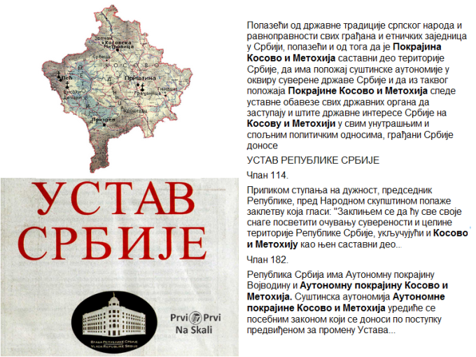 [2] У Уставу Србије Косово и Метохија се помиње више пута, на различитим местима. У преамбули стоји да грађани Србије доносе Устав „полазећи и од тога да је Покрајина Косово и Метохија саставни део Србије, да има положај суштинске аутономије у оквиру суверене државе Србије и да из таквог положаја Покрајине Косово и Метохија следе уставне обавезе свих државних органа да заступају и штите државне интересе Србије на Косову и Метохији у свим унутрашњим и спољним политичким односима“. Уставом дефинисана заклетва председника Републике почиње: „Заклињем се да ћу све своје снаге посветити очувању суверености и целине територије Републике Србије, укључујући и Косово и Метохију као њен саставни део (…)“ (чл. 114). У делу Устава који се односи на територијално уређење пише да: „Република Србија има (…) Аутономну покрајину Косово и Метохију. Суштинска аутономија Аутономне покрајине Косово и Метохија уредиће се посебним законом који се доноси по поступку предвиђеном за промену Устава“ (чл. 182).