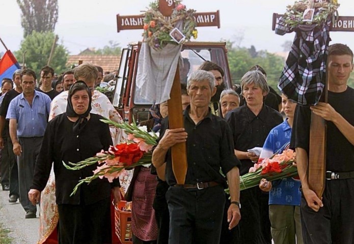 Погребна поворка за масакрираних 14 српских жетелаца у Старом Грацку, 28. јул 1999. (Фото: EPA/Louisa Goulimaki)