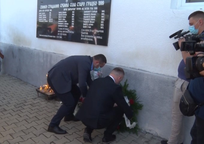 Полагање венаца испред спомен-плоче убијеним жетеоцима у Старом Грацку, 23. јул 2020. (Фото: Снимак екрана/Јутјуб)