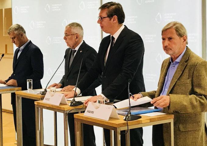 У том контексту позабавићемо се боравком и активностима Александра Вучића и Хашима Тачија на Европском форуму у Алпбаху 25.08.2018, као и разговорима које су, вече пре тога, њих двојица водила под посредништвом премијера Аустрије Себастијана Курца и европског комесара Јоханеса Хана.