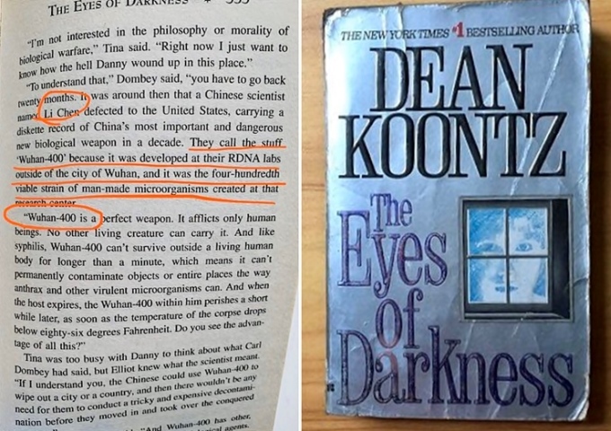 Сада већ далеке 1981. године амерички писац Дин Кунц (Dean Koontz) у свом роману „Очи таме“ описао је вирус назван „Вухан 400“, који показује клиничке сличности са данашњим COVID-19. Иако у овом хорор-трилеру вирус има стопостотну смртност и представља тајно оружје кинеске владе (која заиста у близини Вухана има Институт за вирологију), чињеницу да се вирус прво испољио у Вухану, да напада дисајне путеве и има симптоме испољавања сличне онима који су у роману описани не треба олако занемаривати. Тим пре што је тзв. Лабараторија максималне биолошке сигурности у Вухану основана 2014. године, дакле 33 године после писања овог романа.