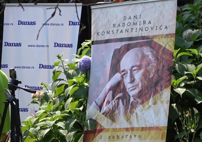 Рол-ап банери са рекламом дневних новина „Данас“ и ликом Радомира Константиновића у дворишту његове родне куће у Ивањици поводом разговора о 50. годишњици објављивања „Филозофије паланке“, 25. август 2019. – Фото: Снимак екрана/Нови Оптимизам