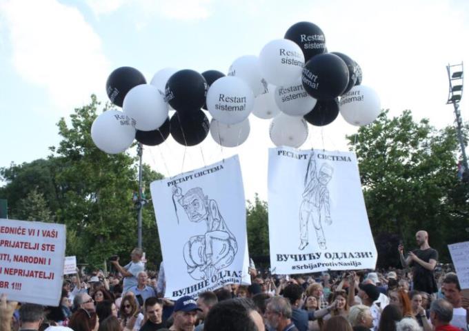 Учесници протеста у Београду пуштају балоне са поруком „Вучићу одлази“ – Фото: ФоНет/Зоран Мрђа