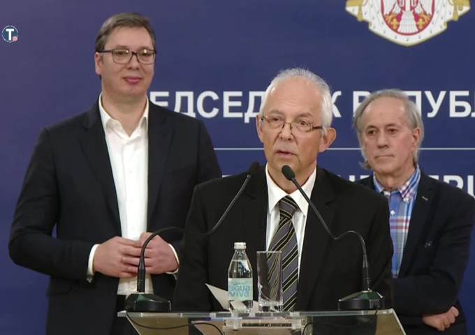 Председник Вучић и др Предраг Кон приликом конференције за медије у председништву Србије – Фото: Снимак екрана/Телеграф ТВ