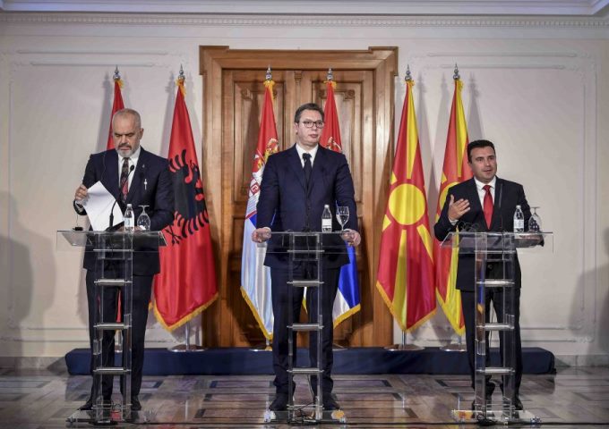 Еди Рама, Александар Вучић и Зоран Заев на конференцији за штампу након разговора о иницијативи неформално названој „мали Шенген”, Охрид, 9. новембар 2019. (Фото: Влада Р. Северне Македоније)