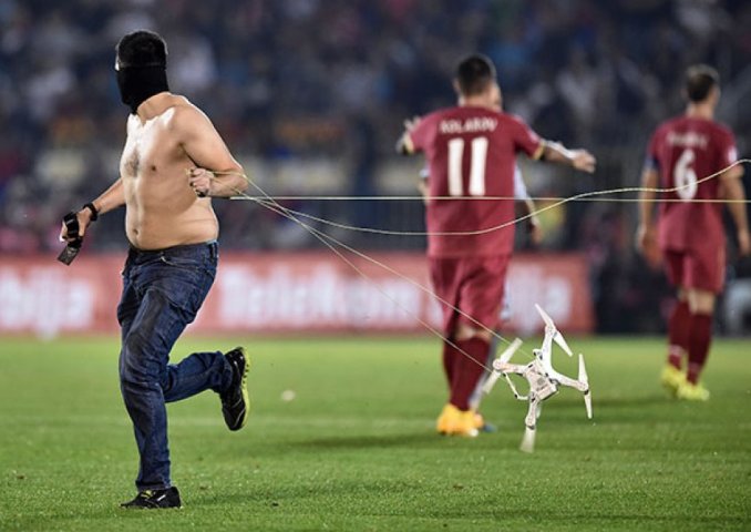 И онда, на 4-5 минута пред полувреме, хук и гласно негодовање са источне и јужне трибине. У кадру на ТВ видимо неколико димних удара и петарди на терену. Не знамо ста се догађа. И онда, камера пребацује и видимо квадрикоптер (у даљем тексту „дрон“ – иако нетачно, лакше је за писање) за који је закачено нешто што личи на заставу у албанским бојама. Кладим се да нико, тада, на стадиону није могао да види шта та „застава“ представља. Судија је прекинуо утакмицу и сви су гледали у ту летелицу. Са трибина се чуло гласно негодовање и вика. Било је петарди и свега, али нико није (још) улазио на терен.