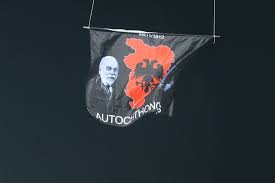 (Одмах да разјаснимо: Не ради се ни о каквој застави, већ о пропагандом, политичком плакату, памфлету, одштампаном на платну. Сви знамо како изгледа застава Албаније, па и застава ткз. Косова, али овај памфлет нема ништа са тим. На њој се види мапа ткз. „велике Албаније“ и представља отворену провокацију за све земље чије делове укључује).