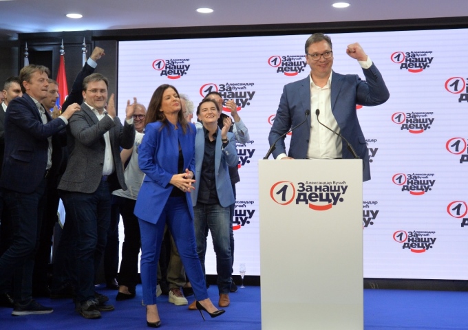 Председник Србије Александар Вучић са члановима странке слави победу листе „Александар Вучић – За нашу децу” на парламентарним изборима, Београд, 21. јун 2020. – Фото: Танјуг/Зоран Жестић