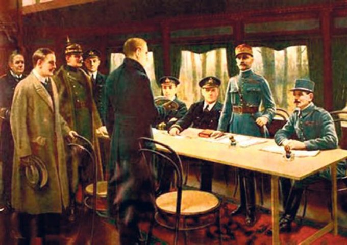 Једанаестог дана, једанаестог месеца, у једанаест часова 1918. године званично су престала борбена дејства у Првом светском рату. Примирје је потписано у специјалном штабном вагону маршала Фердинанда Фоша, усред шуме близу раскршћа Ретонд код града Компијења, у раним јутарњим сатима, у 5.15. Одмах је упућен телеграм трупама са обе стране линије фронта да у 11 часова обуставе борбу и остану на достигнутим линијама до даљег наређења. У исто време, звона широм Француске огласила су да се предала и последња непријатељска сила. На Западном фронту оружје је умукнуло. Два сата доцније, у седишту Врховне команде, у месту Спау, немачки цар Вилхелм Други званично је абдицирао и тако је немачко царство престало да постоји. Силазећи са престола, кајзер је изговорио реченицу која ће у много чему разјаснити пораз сила Осовине у најужаснијем сукобу који је свет видео: