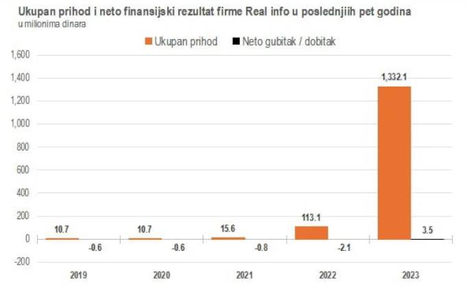 Ни након што је постала ћерка фирма „14. октобра“, Реал Инфо није имао озбиљнијих пословних активности и резултата, јер је све до 2021. укупан приход био 15,6 милиона динара, а годинама уназад је бележио губитке. Чак ни те 2022, када је почела руска агресија на Украјину, Реал Инфо није заобишао губитак од 2,1 милион, упркос расту прихода од чак 623 одсто, на 113,1 милион динара. Али, већ следеће године фирма је „експлодирала“, јер је приход увећала за још 1.078 одсто, на 1,33 милијарде динара. Само у 2023. та фирма остварила је много веће приходе него за све године од како је основана.