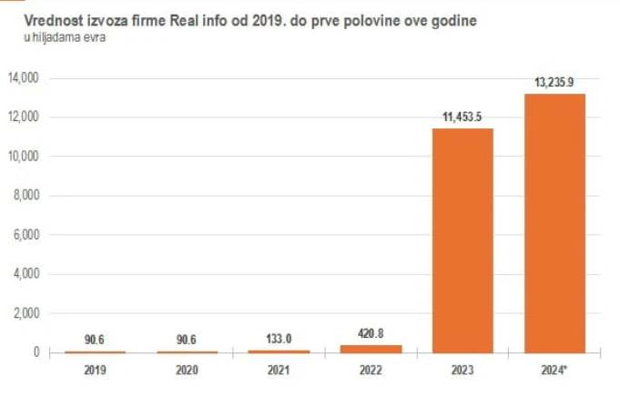 Све су прилике да ће ове године Реал Инфо поставити нове рекорде. На то указује и податак да је у првих шест месеци већ извезла робу вредну 1,55 милијарди динара или око 13,2 милиона евра, за 16 одсто више него у целој 2023. При томе, више од 90 одсто извезене робе завршава у Словачкој.