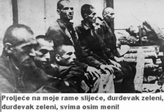 У атмосфери страха, гнева, резигнације и беса, члан некадашњег српског певачког друштва „Слога“ запевао је „Ђурђевдан“. Његов извежбани баритон одјекнуо је над композицијом смрти као вид отпора хрватским фашистима, и јасна порука да ЂУРЂЕВДАН умрети неће док буде Срба, али и опроштај од родног Сарајева и остатка породице.