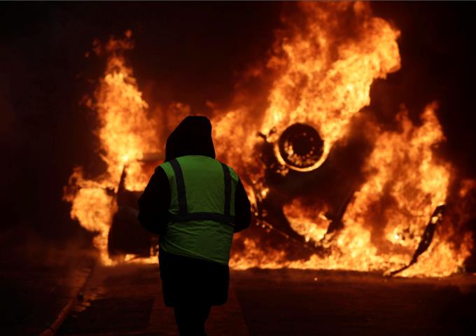 Припадник француског покрета „Жути прслуци“ посматра запаљени аутомобил у близини Јелисејских поља, Париз, 1. децембар 2018.