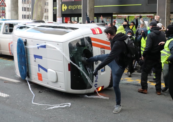 Припадници белгијског покрета „Жути прслуци“ демолирају полицијски аутомобил, Брисел, 30. новембар 2018. (фото Ројтерс)