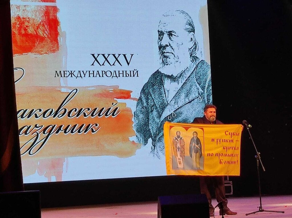 Што се тиче Србије, стижем из земље чији народ на Западу називају „малим Русима на Балкану“. И данас, када видите такве потоке лажи које западна пропаганда протура против Русије и руске историје, сетите се да је као и код свих ранијих „налета на Исток“ то почињало нападом на Србију. Бомбардовање Србије 1999. године и поток лажи против србског народа, представљало је генералну пробу уочи новог западног нашествија на Русију. Не бих много говорио овде, показаћу Вам заставу која све објашњава, заставу на којој је исписан наслов моје књиге на руском језику – „Срби и Руси – браћа по промисли Божијој“.
