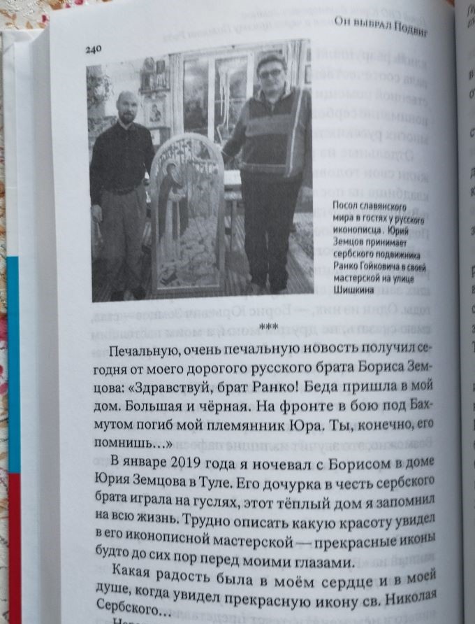 Ту књигу добијам на поклон те вечери од Бориса и тако комплетирам трилогију о овом истинском православном витезу. У књизи је штампан и мој осврт о овом великом човеку, емоције је тешко обуздати. Имао сам част да преспавам у његовом дому у Тули, да уживам у предивним иконама у његовом сликарском атељеу, да слушам дивно музицирање његове дивне деце, да са њим обиђем музеј знамените Куликовске битке… На 240 страници књиге моја слика са Јуријем у његовом атељеу, уз натпис: Амбасадор словенског света у гостима код руског иконописца: Јури Земцов је угостио србског подвижника Ранка Гојковића у свом атељеу у улици Шишкина.