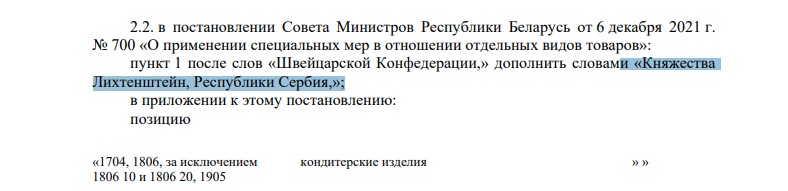 Сагласно уредби Владе „О примени посебних мера за одређене врсте робе” донете у децембру 2021. године, забрана увоза односи се на низ производа из земаља ЕУ, САД, Канаде, Норвешке, Албаније, Исланда, Северне Македоније, Уједињеног Краљевства, Црне Горе, Швајцарске.
