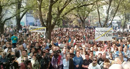 Лево: Госпођа Софија Милошевић, бивша одборница радикала, данас чланица СНС прети и добацује функционерима Демократске странке.