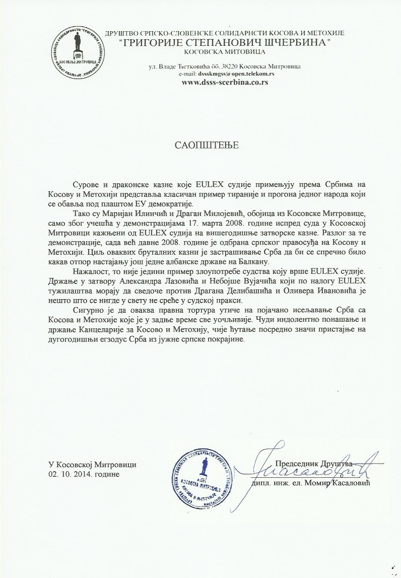 euleks-kosovo-1328585176-92453Поводом Еулексових антиправних одлука на суђењима Србима, какве сразмерно времену ни у феудално доба нису биле честа појава, ДССС „Шчербина“ обратило се јавности.