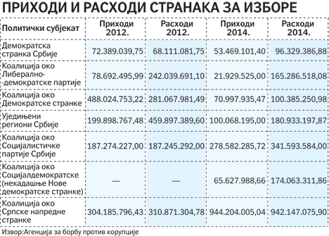 Из извештаја о последњој кампањи за парламентарне изборе види се да је највише новца потрошила владајућа коалиција окупљена око Српске напредне странке – око 942 милиона динара, а коалиција Русинске демократске странке и Словачке демократске странке није дала ни динар. Ова коалиција је, додуше, освојила и најмање гласова (3.182), али ни листа националних заједница чији је носилац био Емир Елфић није много боље прошла – освојила је 800 гласова више, а уложила је у кампању око 1,4 милиона динара.