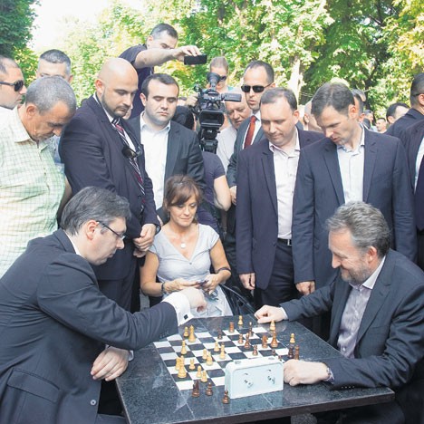 Неко би рекао да је дегутантно што су на штандовима са сувенирима на улазу у Калемегдан, дуж којих су прошли представници двеју земаља, у том тренутку била изложена, као и увек, и четничка обележја. Ипак, биће да их домаћин и гости, опасани гломазним појасом обезбеђења, нису ни уочили, већ су се зауставили код фонтане „Борба”. Окупљени грађани тамо су их дочекали аплаузом, а чланови панчевачког КУД „Станко Пауновић” – сплетом народних игара. После свечаног дела, Вучић и Изетбеговић сели су за сто надомак фонтане и почели партију шаха. Иванић и Човић су направили рокаду према оближњој клупи заваљеној у хлад.