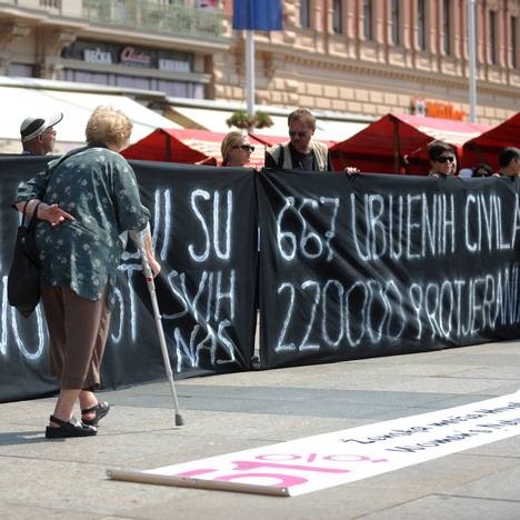 Због таквог расположења, Загреб у готово еуфоричној атмосфери дочекује данашњи дан. Смутњу у веселу загребачку атмосферу донекле су унеле активисткиње Центра за жртве рата (нешто попут српских Жена у црном) које су на Тргу бана Јелачића, нешто пре поднева, развиле транспаренте на којима је било исписано „667 убијених, 220.000 прогнаних” . Тек малобројне новинарске екипе и понеки знатижељник или страни туриста обратили су пажњу на њихову акцију. Један гневни старији Загрепчанин коментарисао је са пријатељем да „такво нешто не би могли радити у Израелу” те да оне „вероватно једва чекају да их неко бије па да дигну галаму” .