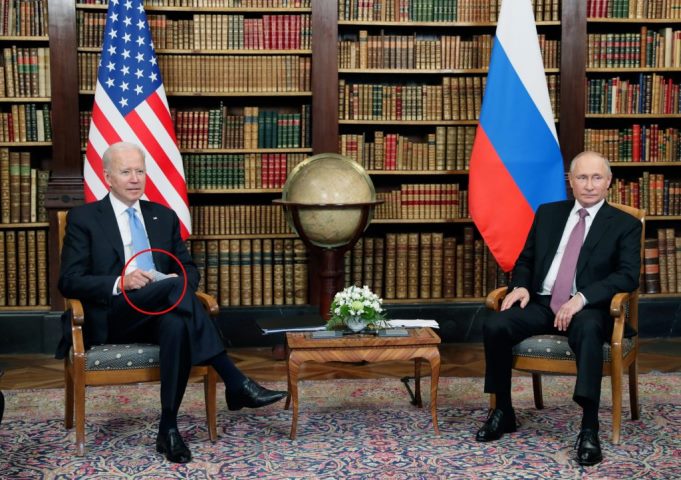 Бајдена су камере снимиле како у руци држи бели лист папира који покушава да сакрије од Путиновог погледа иако су седели један поред другог у Вили Ла Гранж у Швајцарској у Женеви.