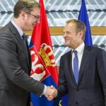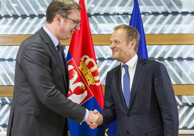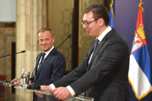 Председник Србије Александар Вучић састао се данас са председником Европског Савета Доналдом Туском. Након састанка, званичници су одржали и конференцију за штампу, на којој је Туск говорио на српском језику.