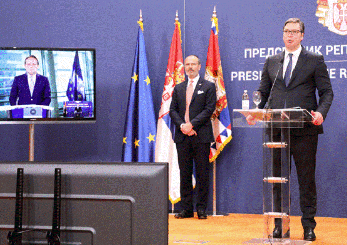 Вучић је поновио да Србија остаје на ЕУ путу, те захвалио комесару Оливеру Вархеију, јер, каже, јер ми у Србији знамо колико је труда, рада и енергије уложио да помогне Србији. Комесар за проширење се, такође, данас обратио путем видео-линка из Брисела, након потписивања споразума, преноси Танјуг.